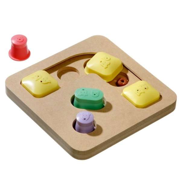 For advanced players! Doggy Brain Train Motion - a motivational and thinking game for dogs. Snacks are placed in depressions, which are then covered with cones. The dog gets its treat by pushing with its paw or snout or by lifting the cones. This game can be played at different levels of difficulty, e.g. by having the dog first lift a cone and then push another cone to get its treat. The cups are in different colors and shapes and each has scent holes. With anti-slip stoppers.