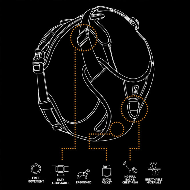 Stay close to your dog on the go with the EXPLOR Ultimate Fit No-Pull Harness, a well-designed, ergonomic dog harness that's ideal for a daily city walk or a big outdoor adventure. Your dog enjoys optimal freedom of movement because the pressure caused by pulling on the leash is evenly distributed across the chest, protecting vital organs in the neck. The harness has two stainless steel attachment rings: one on the back, suitable for calm or older dogs who are easy to control, and a reinforced D-ring in the chest area to control dogs who pull on the leash. The EXPLOR Ultimate Fit No-Pull Harness is adjustable around the neck and chest, which, combined with the durable materials, makes it suitable for almost all dogs. The buckles are located around the middle, so the dog does not have to lift a leg(s) when the harness is put on. To protect the dog's fur and skin from chafing, most of the straps and buckles are covered with soft, breathable materials. In addition, the lightweight but high-quality fabrics used for both the inside and outside dry quickly, which is very convenient if your dog likes to go swimming. To prevent your dog from getting caught on branches while running free, the harness has no loops or protruding parts. The EXPLOR Ultimate Fit also takes your dog's safety in traffic into account. The reflective piping is placed in the right places and ensures optimal visibility in traffic. There is also a special inner pocket for an ID tag in the chest area of the harness, so that the tag remains easily accessible and undamaged. Get out there and EXPLORE!