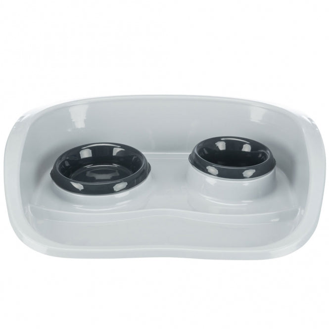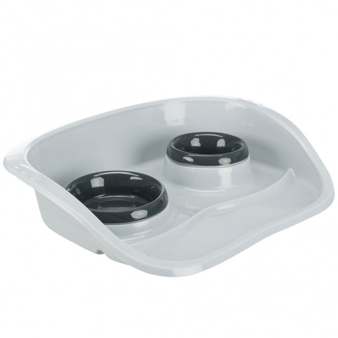 Plastic bowl set with splash guard. The bowls can be removed individually.