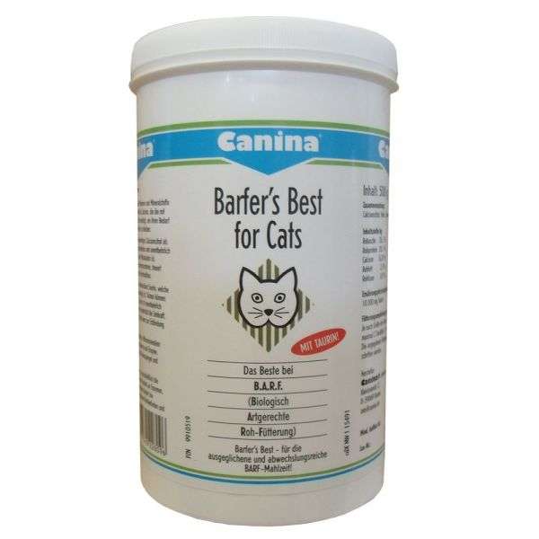 Barfing is becoming increasingly popular among cat owners. Barfers Best for Cats contains all the vitamins and minerals of natural origin, including calcium, that a cat fed raw meat needs every day to meet its needs and remain active and productive. It is therefore an ideal nutritional supplement for biologically appropriate raw feeding. Barfers Best for Cats contains: - all the vitamins and minerals of natural origin, including calcium, that a cat fed raw meat needs every day to meet its needs and remain active and productive. - Calcium citrate as a source of calcium, which is easily absorbed and essential for bone structure, teeth, claws and muscles. Calcium citrate activates numerous enzyme systems, controls nerve impulses and supports heart function. - the amino acid taurine, which is essential (vital) for cats. Cats cannot produce taurine themselves. Taurine is essential for healthy heart function and supports eyesight. Taurine deficiency over a long period of time can lead to blindness. - Natural seaweed provides vitamins, microminerals such as iodine, fluorine and enzymes, as well as amino acids and enzymes. The pigmentation of the coat, nose and paw pads is promoted. - Yeast provides all other vitamins, including those of the B group and biotin. The high content of enzymes, minerals and trace elements promotes motivation, general well-being and protects skin and hair. , Contents: 500g , Composition: Calcium citrate, yeast, seaweed , Ingredients per kg: Calcium 8.24%, crude ash 26.1%, crude protein 20.1%, crude fat 2.0%, crude fiber 0.9% , Nutritional additives per kg: 10,000 mg taurine , Feeding recommendation per animal and day: Depending on the size of the cat, one level teaspoon (approx. 5g), maximum 2 teaspoons per day. The stated feeding recommendation must not be exceeded. Barferss Best for Cats contains no artificial colors or flavors.