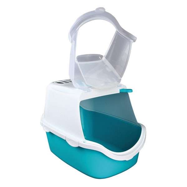 Also included in the delivery are a scoop and a carrying handle, as well as an activated carbon filter that neutralizes unpleasant odors. The double edge profile prevents cat litter and urine from escaping. The toilet is equipped with Easy Click fasteners for quick opening and closing.