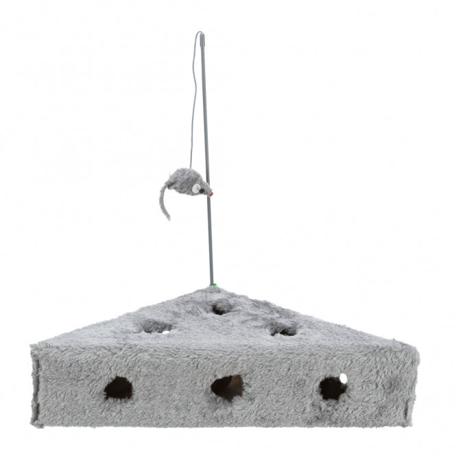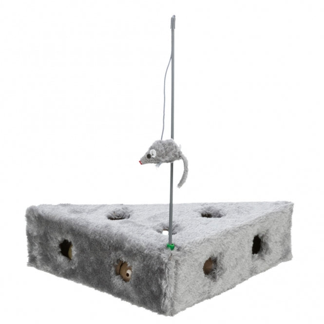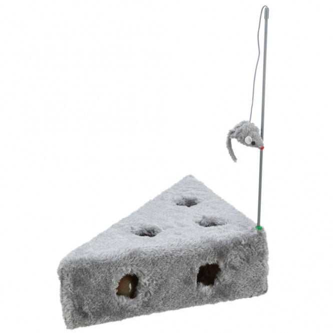 Cat toy with plush cover. Equipped with a plush mouse on a fishing rod and three play balls inside the Cats Cheese.