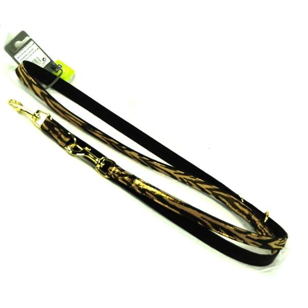 Trendy leash in a cool zebra look. Faux leather in a zebra look (gold). Carabiners and rings are gold-colored. Very soft, robust faux leather.