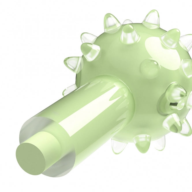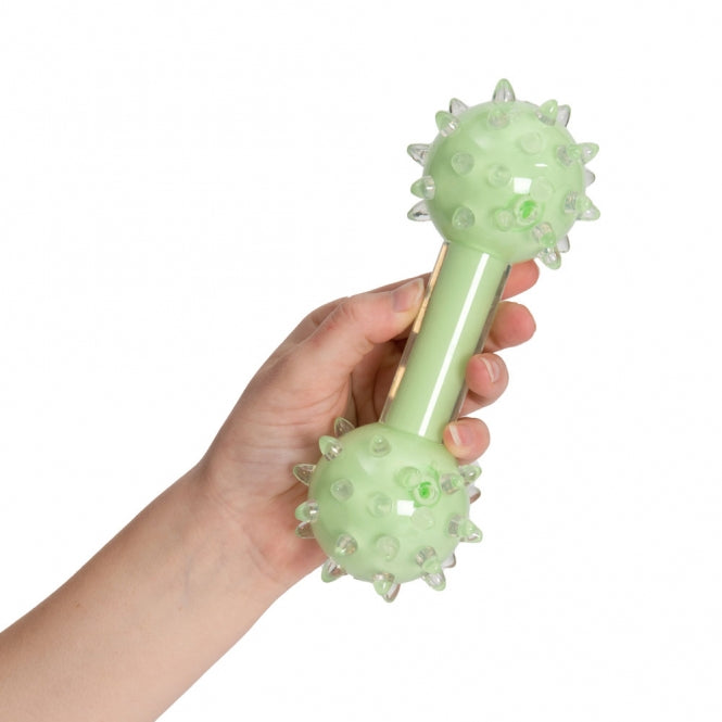 The knobbed dumbbell is green and smells of delicious mint. It is about 18 cm tall.