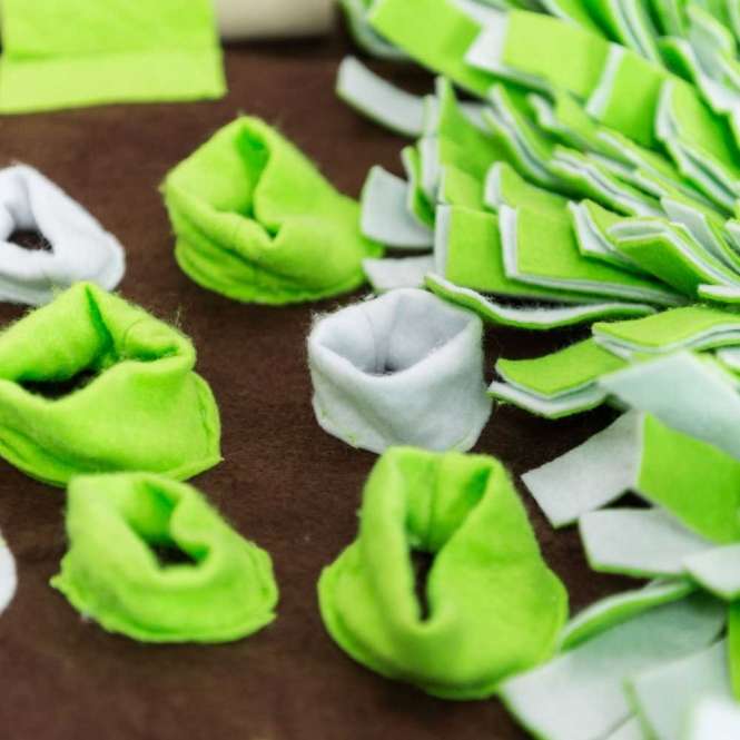 The intelligence sniffing mat is 80 x 80 cm and consists of half a sniffing meadow. The other half consists of over 20 treat hiding places in seven different variations and offers your four-legged friend plenty of activity, challenge and fun.