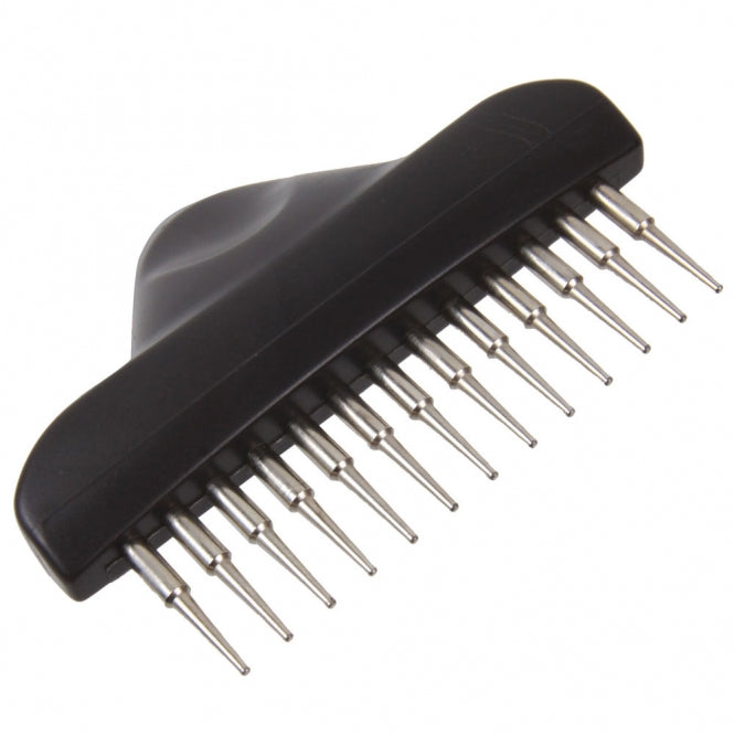 Dieser Fellentwirrer hat einen Kunststoffgriff mit rutschfester Gummieinlage und besitzt rotierende, abgerundete Zinken zur schonenden Fellpflege. Er dient der besonderen Pflege der Unterwolle.