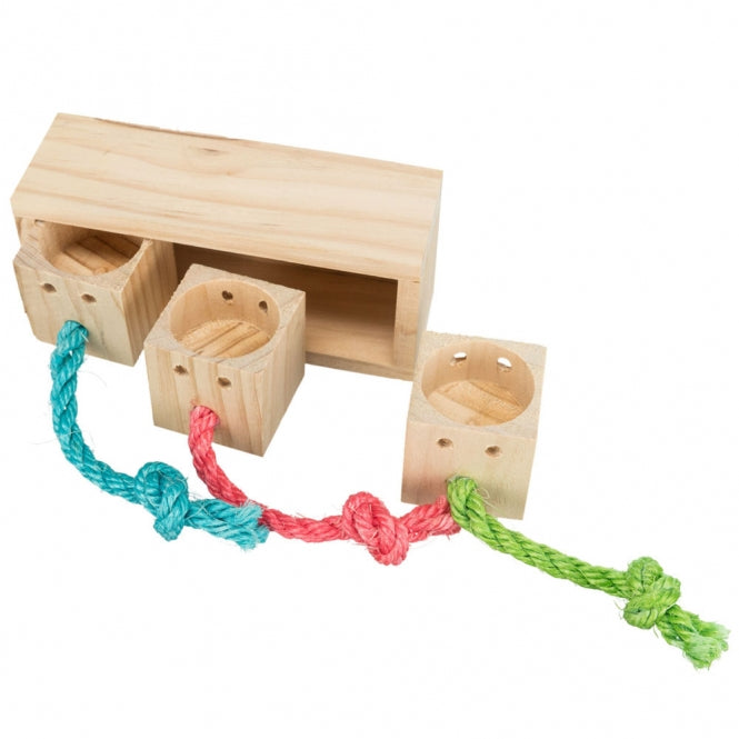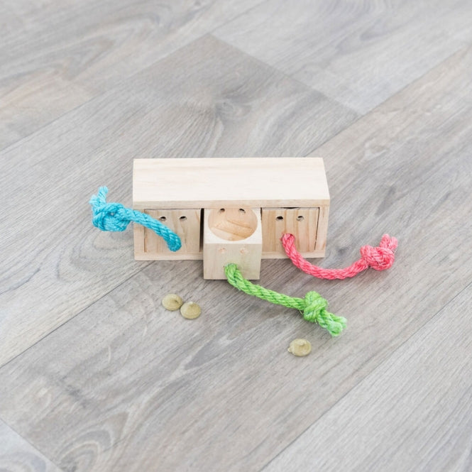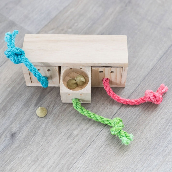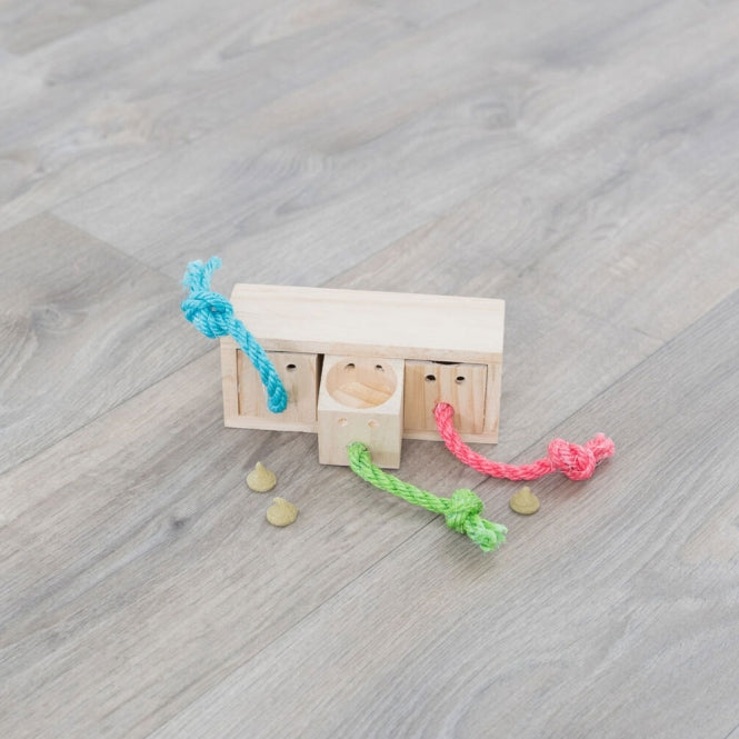 Ob Kaninchen oder Ratte - mit dem Snack Würfel bekommt jedes Kleintier eine neue geistige Herausforderung. Das Spielzeug lässt sich mit Leckerlis befüllen und durch das Herausziehen der Schubladen kommt das Tier an seine Belohnung. Um es dem Nager leichter zu machen, gibt es große Luftlöcher und zwei Schwierigkeitsstufen. So lässt der Erfolg nicht lange auf sich warten. Natürlich ist das Holz unbehandelt und das Produkt tierschutzkonform (§18 AT).